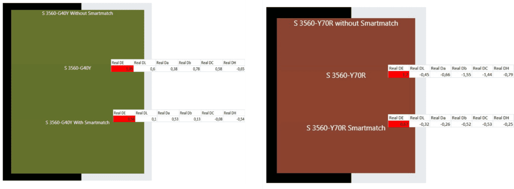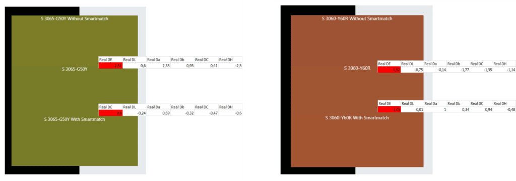 所以,我们既要使用软件计算出一个准确的配方;同时又能够利用历史配方作为配方的修正。而精明配色功能就可以满足这个需求。我们可以看一下实际配色案例中使用精明配色(Smartmatch)功能的效果: